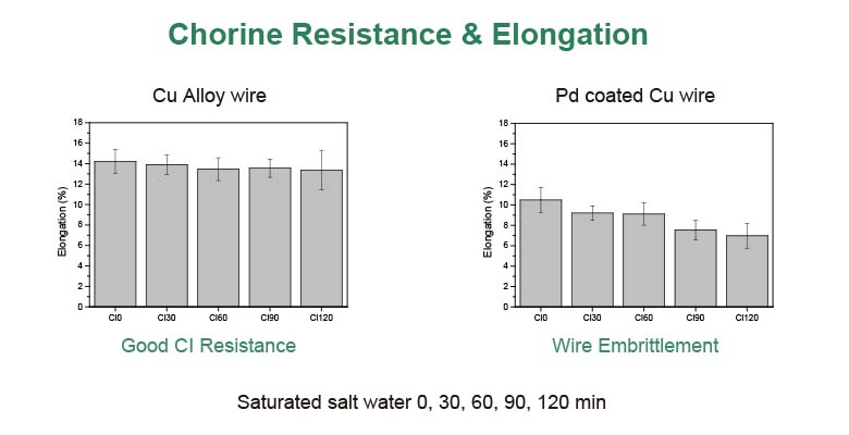 After long process of research and experiments Niche-tech successfully developed a copper alloy bonding wire by evenly mixing appropriate doping into 5N pure Copper. The alloy wire process is more environmental friendly, lower cost with similar reliability in compare to the Pd coated copper wire. In addition, the Alloy wire having a better anti-chlorine and anti-electrical fatigue properties.